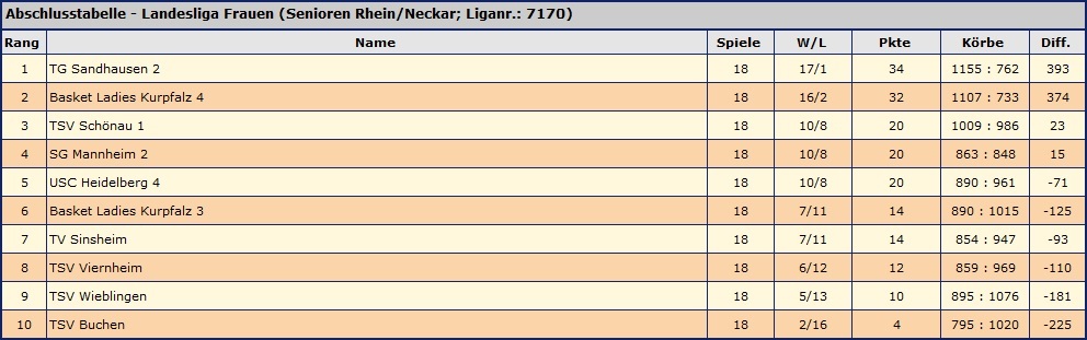 Im neuen Jahr verbesserten sich die bestehenden Probleme leider kaum. Krankheiten, Verletzungen und sonstige Abwesenheiten verhinderten das eigene Spiel zu stabilisieren, sodass man die nächsten sechs Spiele eher deutlicher als in der Hinrunde verlor. Hinzu kam, dass die Damen des TV Sinsheim, die bisher hinter den Wieblingerinnen standen, plötzlich überraschend viele Spiele gewannen und damit die Tabelle von unten „aufrollten“. Erst in den letzten drei Saisonspielen schaffte man es wieder deutliche bessere Leistungen abzuliefern, sodass das Heimspiel gegen Sinsheim deutlich gewonnen, das Auswärtsspiel in Schönau – nur zu sechst angetreten – trotz richtig gutem Basketball nur knapp verloren wurde und man sich im letzten Spiel zu Hause gegen Buchen nach großem Kampf mit einem knappen Sieg aus der Saison verabschieden konnte. Laut aktuellem Stand reicht der neunte Platz in der folgenden Abschlusstabelle zum Klassenerhalt: