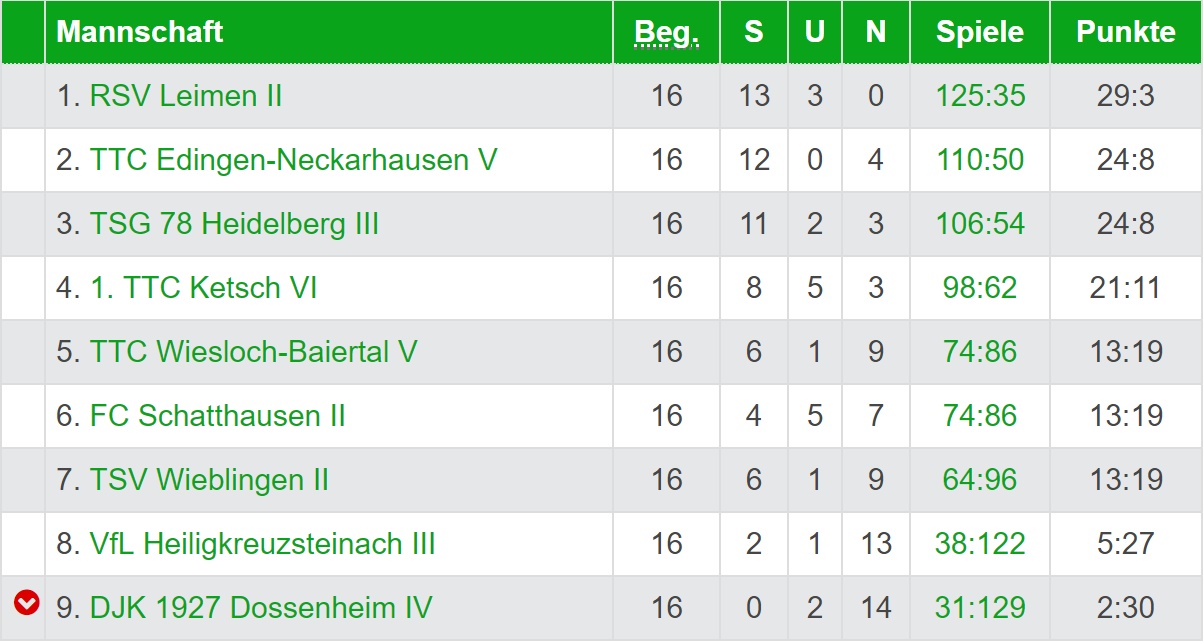 Ein letztes Verbandsspiel bot der Mannschaft noch die Möglichkeit wenigsten zwei „fehlende“ Siegpunkte wieder gutzumachen. Zu Hause empfingen wir den 1. TTC Ketsch VI, gegen den wir in der Vorrunde nur sehr knapp 4:6 verloren und uns Hoffnungen machten und eine reale Chance sahen mit einer guten Aufstellung gewinnen zu können. Unsere Gegner dachten wohl das gleiche und traten mit einer veränderten Aufstellung an, die aber auch im Vergleich zur Vorrunde spielstärker war. Bis 22:20h hat unsere Mannschaft gekämpft, acht von zehn Spielen gingen über vier oder fünf Sätze, aber am Ende verlor der TSV mit 2:8 nicht nur dieses eine Verbandsspiel, sondern auch den Wettkampf um einen guten mittleren Tabellenplatz. Trotz gleicher Tabellenpunkte mit dem 5. Platzierten, aber schlechteres Spieleverhältnis, rutschte unsere 2. Mannschaft für zum Ende der Verbandsrunde auf den 7. Tabellenplatz ab.